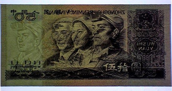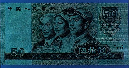 幸运的是,即使是普通的收藏者,也可以通过很多途径发现这样的人为改动——事实上,Pick目录中也提到了一些方法。1990年b版50元发行的时候,新增了某些防伪特征,包括紫外线荧光油墨和安全线。