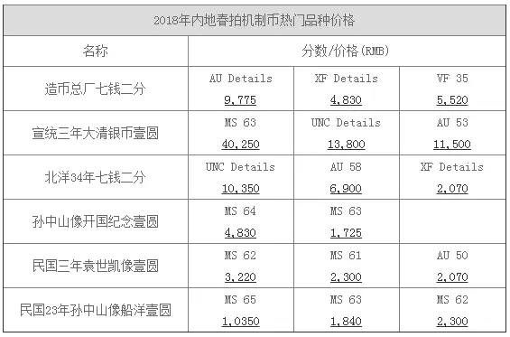 此外,本次内地春拍中除了一些精品、顶级钱币拍出不俗价格外,一些体现市场风向标类的品种,如造币总厂、宣三壹圆、孙中山像开国纪念、民国三年袁世凯像等,好品相、好分数币价格相对较高,对比2018年香港春拍,价格变化不大,整体行情相对稳定。