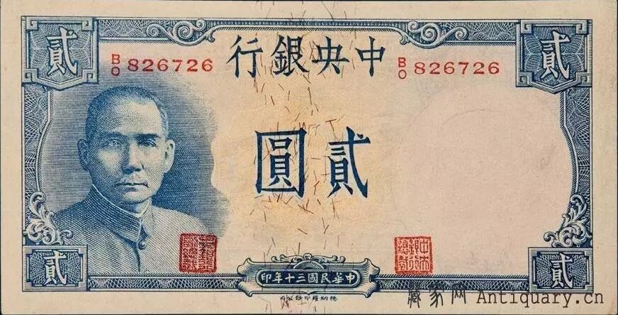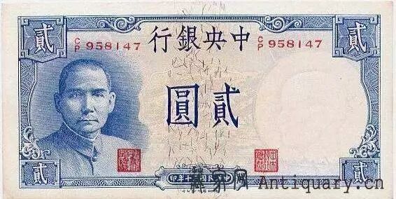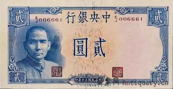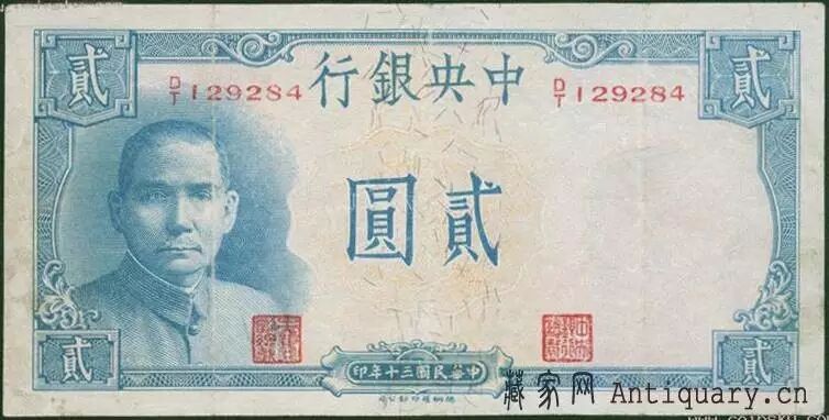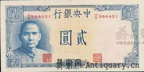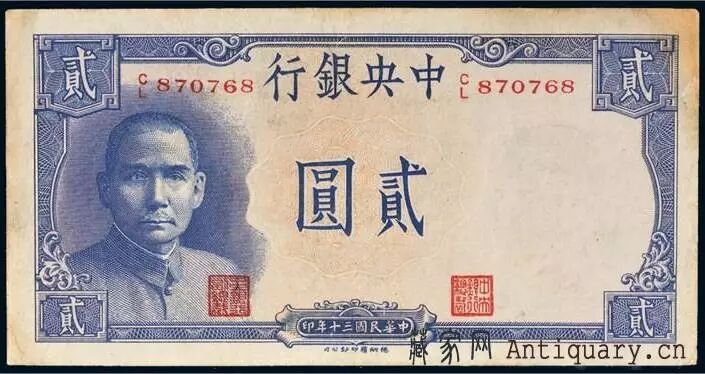 中央银行是南京国民政府时期的国家银行。由于美国实行“白银法案”造成中国的白银大量流失,政府成功的实施“币制改革”。白银收为国有储备,使用“法币”融通市面。这张纸币就是“法币”券的大珍品。