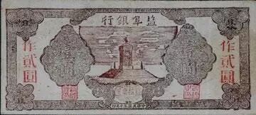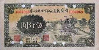 抗战爆发后,八路军挺进山西、河北、察哈尔三省交界地区,创建了晋察冀边区根据地。当时这一地区货币极为混乱,既有法币,还有省地方银行币、商业银行币,更多的是五花八门的地方私票,这些货币流通区域界线分明,各把一方,极不利于抗战根据地经济的发展。1938年晋察冀边区军政民召开第一次代表大会,通过了设立银行的决议,同年3月20日晋察冀边区银行在山西五台县石嘴村成立,经理关学文。边区银行的建立和抗币的发行粉碎了日寇的经济封锁,敌人恼羞成怒,派特务暗中侦察,派飞机轰炸或派重兵围剿扫荡,企图消灭边区银行。抗日军民与敌人斗志斗勇,粉碎了敌人的疯狂进攻,保卫了边区银行。该行除发行抗币、代理金库、承募公债、经营一般银行业务外,还要与敌伪的“联合准备银行”及所发“联银券”开展争夺流通阵地的艰巨斗争。该行纸币中珍稀品种有1938年贰角券直票,图案为北京颐和园铜牛与十七孔桥,A字轨小号码,2013年北京嘉德高价成交。而另一枚1944年伍仟元的票样在2009年诚轩春拍落槌价为27万元(不含佣金),创单枚抗币拍卖纪录。