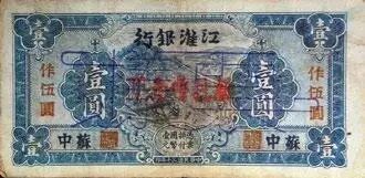 还有石印版江淮银行1941年壹元,也是稀少品种,先在面值两旁加盖“作抗币伍元”,数年后在正面图案处又加盖“新抗币壹元”。