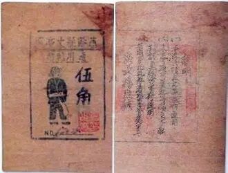 而浙东根据地在浙东银行成立前的抗币别具特色,因印钞所需设备、材料和技术极其缺乏,一些抗币采用简单的单色油印,如慈溪县丈亭区通用辅币伍角,正面为蓝色武装战士图,背面蜡刻油印三条说明文字,分别加盖“楊照诚”、“慈溪县丈亭区署”朱红印章,是浙东抗币的稀罕品种。