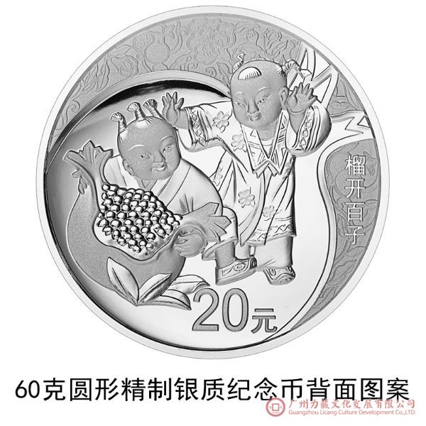 60克圆形银质“榴开百子”纪念币背面图案为石榴、童子、吉祥装饰纹样等组合图案,并刊“榴开百子”字样及面额。