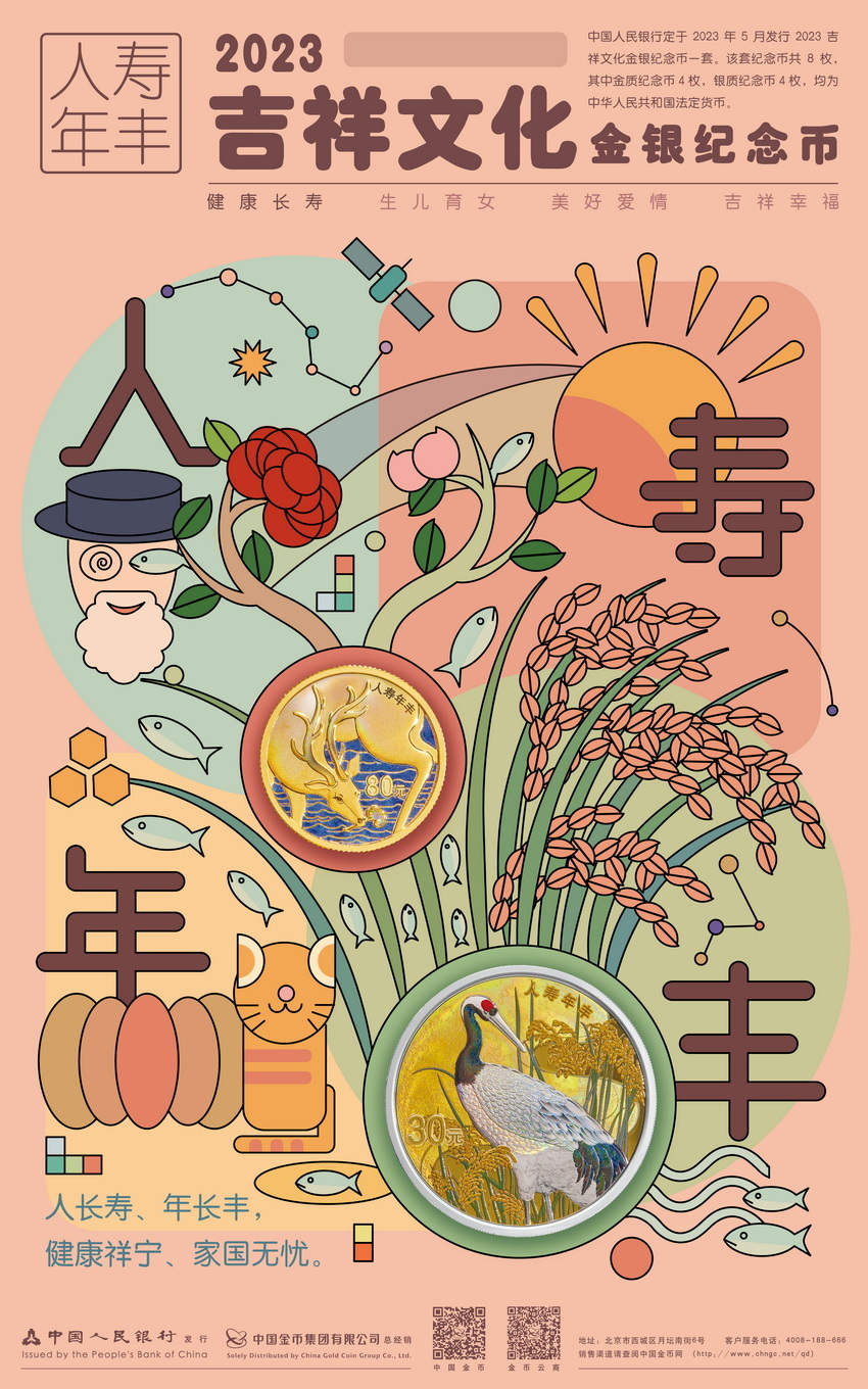 中国人民银行定于2023年5月发行2023吉祥文化金银纪念币,以健康长寿、生儿育女、美好爱情、吉祥幸福为四大表现主题,启用了与主题对应的“人寿年丰”“前程似锦”“比翼双飞”和“平安喜乐”的崭新吉祥语,并作为币面图案的创意构思和设计元素。该套纪念币共8枚,其中金币4枚、银币4枚,均为中华人民共和国法定货币。